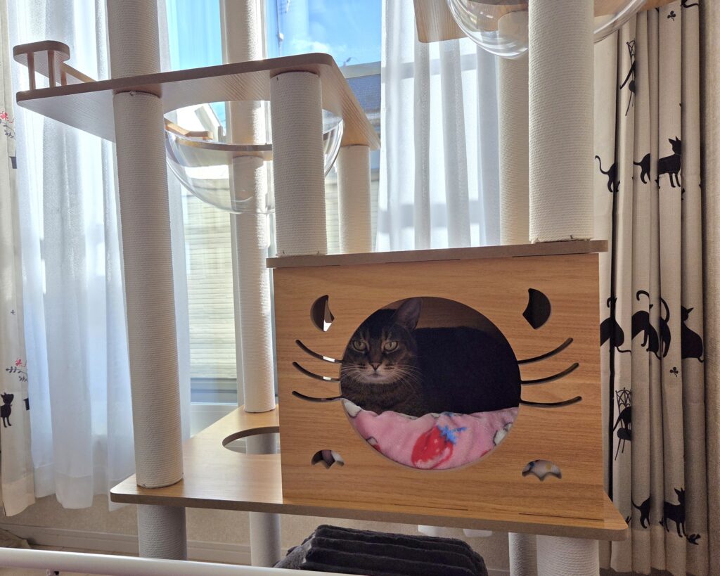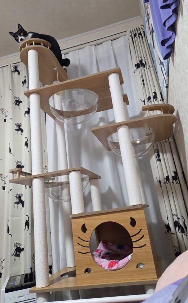 2匹の猫がいる我が家では、性格の違いも大事なポイントです。上へ登りたい子もいれば、静かな場所で落ち着きたい猫もいます、下部に隠れ家スペースがあることは外せませんでした。